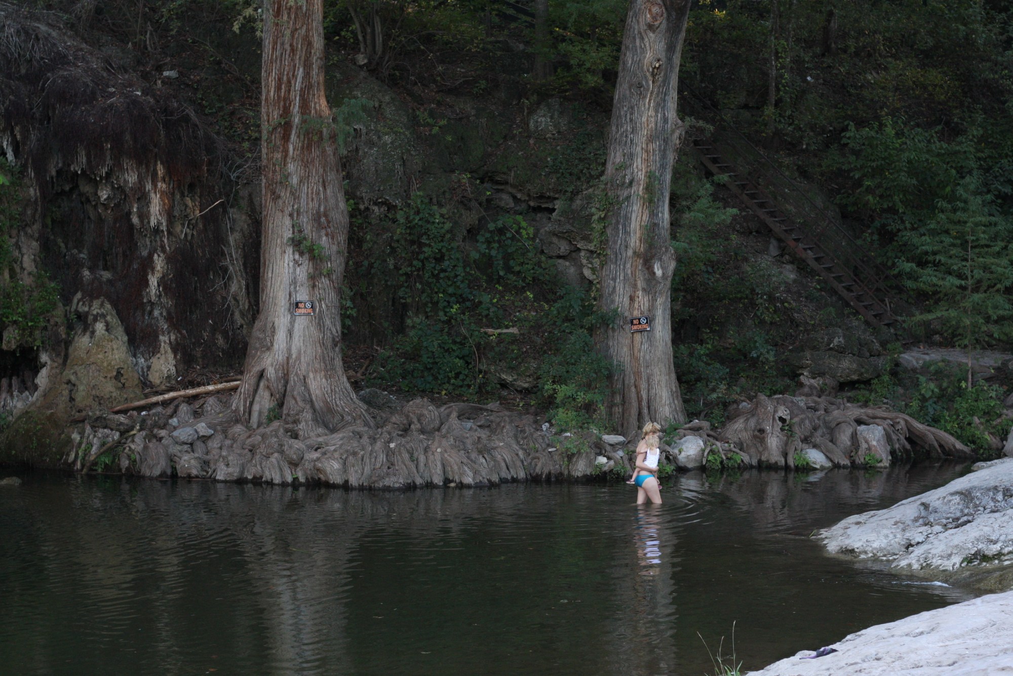 Between Llano & Austin, Texas, lies Krause Natural Springs & Camping. Of course when we heard “springs” our minds thought of “hot springs” and we didn’t put much thought into the advertised year-round constant temperature of 68 degrees. We quickly realized they weren’t hot springs, or even warm springs. Carrie and I each took quick dips, and we’ll admit it was refreshing, but not a place you want to just hang out in unless it’s really hot outside. The big plus: the setting was absolutely gorgeous. Just ignore the No Smoking signs nailed to trees…sad that isn’t just a given in a place like this.